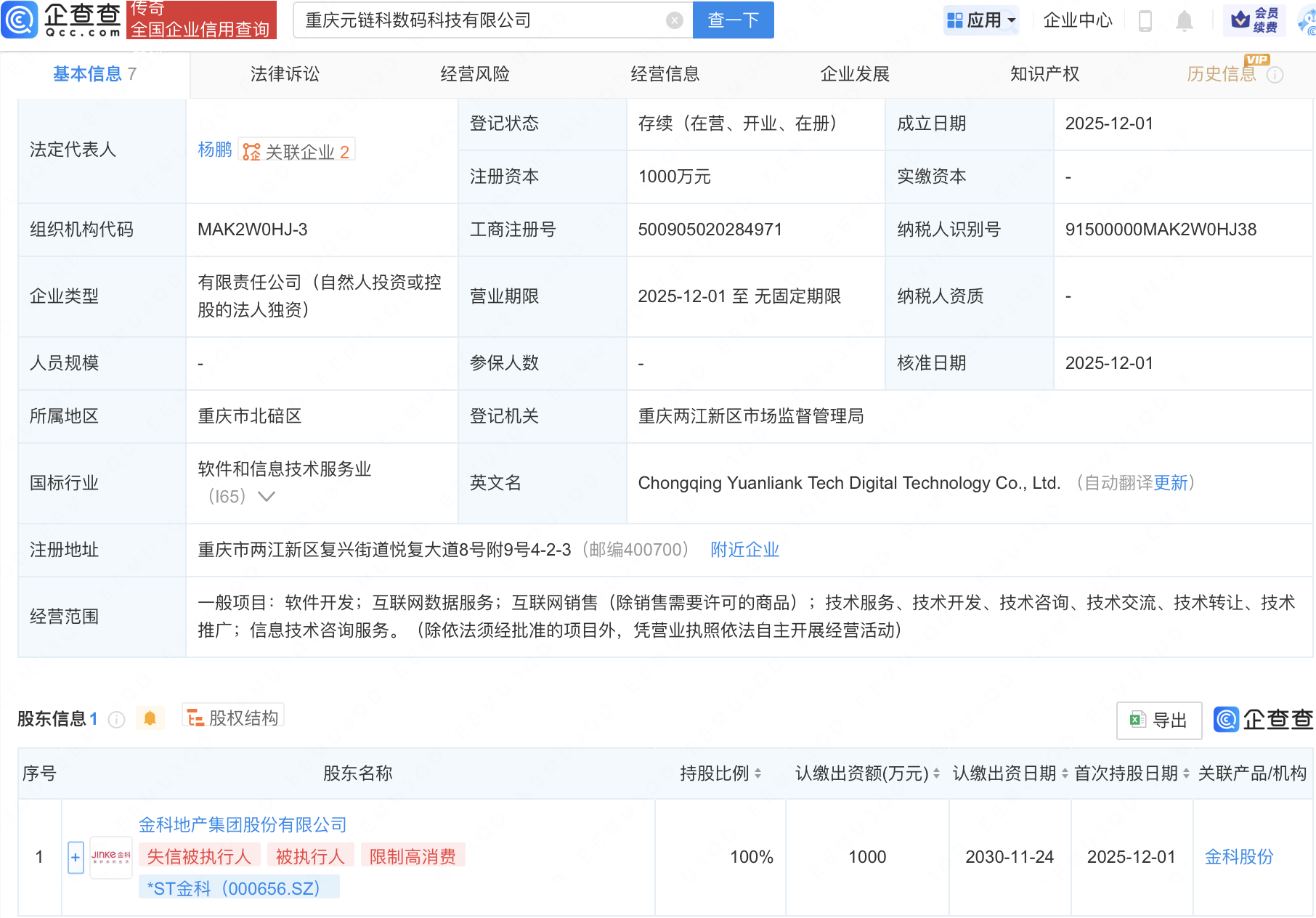 近日,重庆元链科数码科技有限公司成立,注册资本1000万元,经营范围包含:软件开发;互联网数据服务;互联网销售(除销售需要许可的商品)等。企查查股权穿透显示星星配资,该公司由*ST金科(000656)全资持股。