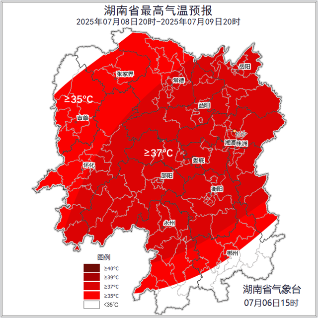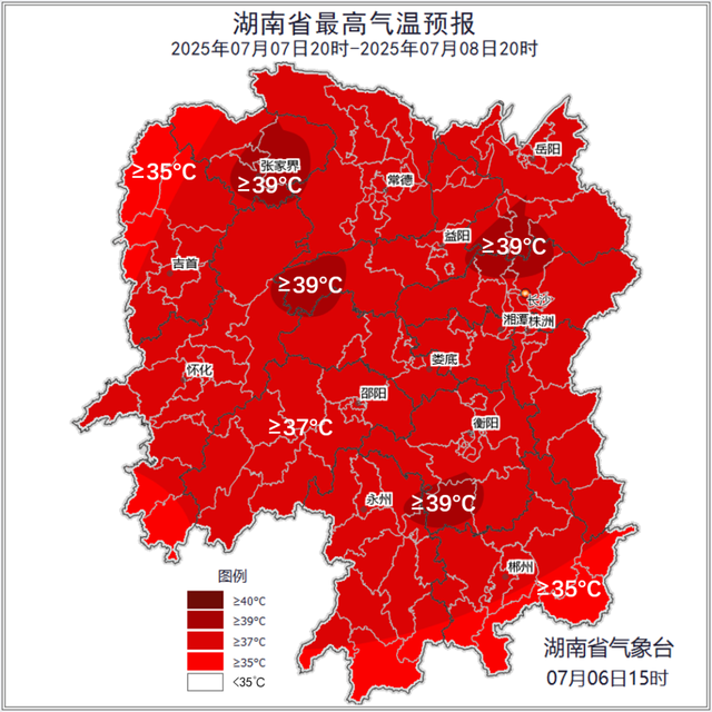 湖南省气象台预计7日白天,全省大部分地区有37℃以上高温,湘中以北局地将达39℃以上,请做好防范。