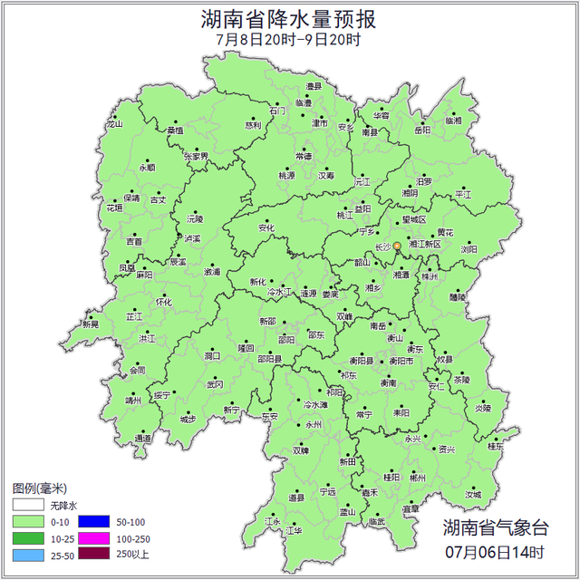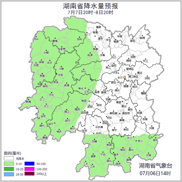 7日晚上至8日白天,晴天间多云,湘西、湘南有阵雨或雷阵雨;南风2~3级,雷雨时局地阵风7~9级;最高气温36~39℃,最低气温25~29℃。
